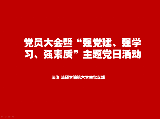2022年4月24日下午四时,中共动漫之家 、法律硕士教育学院第六学生党支部召开党员大会暨“强党建、强学习、强素质”主题党日活动。支部书记王斌通领学,支部副书记杨宇航主持,党支部全体正式党员、预备党员、发展对象、积极分子参加并讨论。