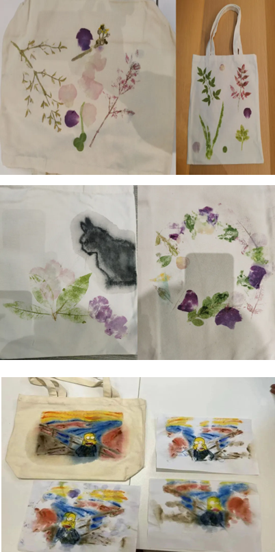在手绘正式开始前,晓明老师还为同学们讲解了主要的构图技巧,并引导同学们进行积极的尝试。活动过程中,晓明老师悉心指导同学们在布袋上绘画,并给出建议。本次活动为大家提供了布袋、工具锤、胶带、水粉颜料、绘图工具等材料,同学们自由选择绘画材料以及拓印植物,制作了专属于自己的精美布袋。
