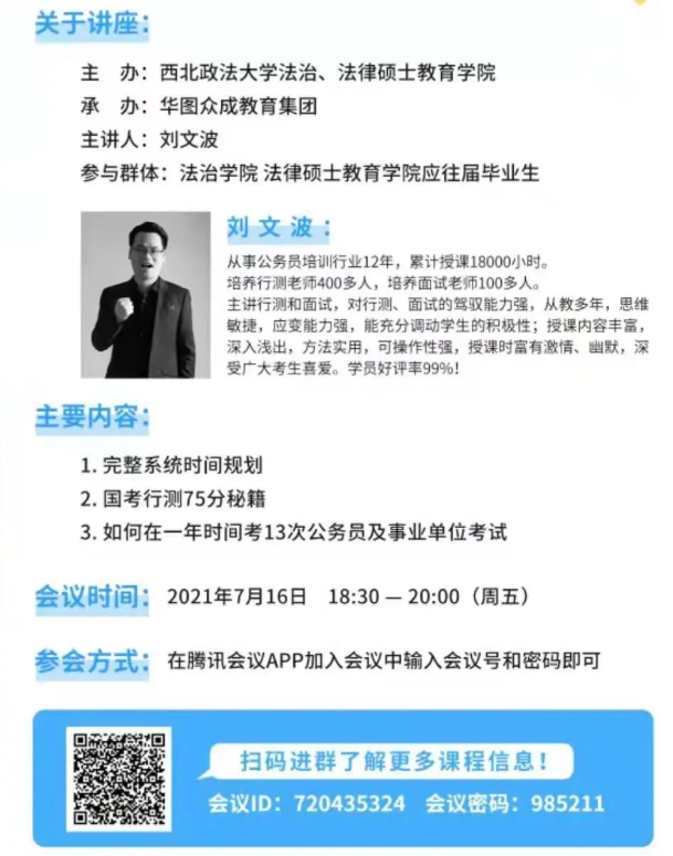 为扎实推进党史学习教育,切实落实“我为群众办实事”实践活动要求,助力广大学生公考,7 月16 日下午18:30,动漫之家 与华图众成联合举办公考讲座,旨在通过构建优质平台,介绍优质课程,提升就业质量。讲座以线上会议的方式进行,广大有意向参加公考的同学通过腾讯会议参加,讲座受到了同学们的热烈欢迎,同学们反应热烈,踊跃参与。