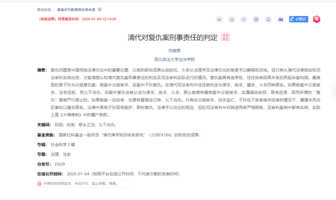 2026年1月4日,闫晓君教授在法学核心期刊《政法论坛》上发表学术论文《清代对复仇案刑事责任的判定》。