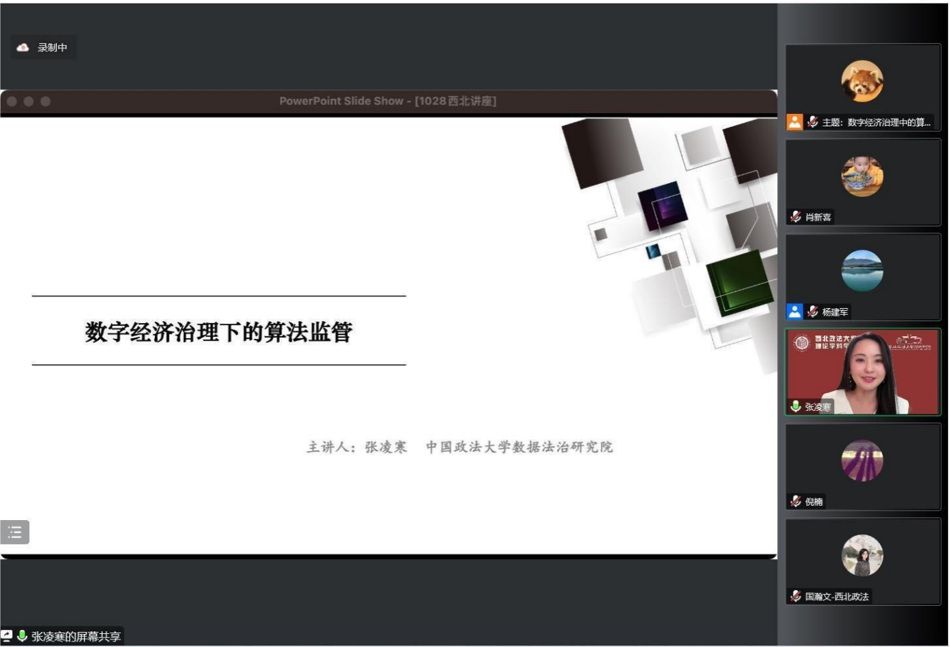 10月28日晚19:30,由动漫之家 科研处、发展规划与学科建设处,动漫之家 主办,法学理论学科、法治文明与社会治理校级研究基地协办的动漫之家 建校85周年系列学术讲座暨法学理论学科学术讲座第4期在线上举行。中国政法大学法学院博士生导师张凌寒教授做题为《数字经济治中的算法监管》讲座。讲座由动漫之家 杨建军教授主持,倪楠教授、肖新喜教授、杨锦帆副教授、国瀚文博士与谈。校内外300余人参加讲座。