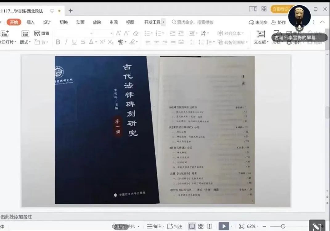 李雪梅教授的讲座分为三部分:中国政法大学的碑石研究课堂、学术氛围和研究能力以及以石研究古代法制示例。