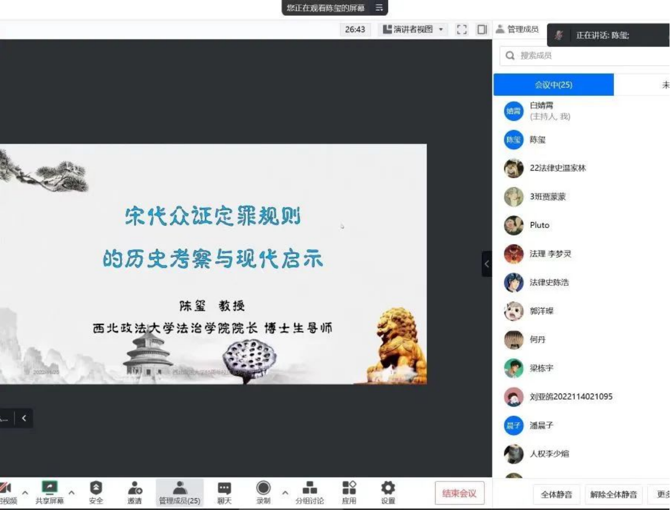 2022年11月25日下午,由动漫之家 、中华法系与法治文明研究院、枫桥经验与社会治理研究院、马锡五审判方式研究院联合主办的“长安法史论坛”第216期学术报告会以线上方式顺利举办。本次报告会特别邀请动漫之家 院长、博士生导师陈玺教授以“宋代众证定罪规则的历史考察与现代启示”为题作学术讲座,动漫之家 何丹博士担任主持人。动漫之家 中华法系与法治文明研究院执行院长、硕士生导师王斌通博士,动漫之家 宋鋆博士、潘晨子博士生担任与谈人。我校教师、博士研究生、硕士研究生等40余人参加讲座。