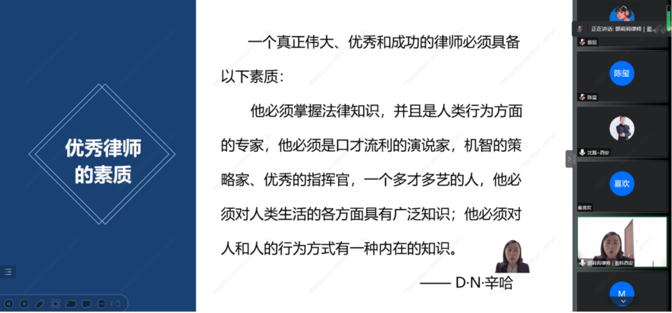 随后北京市盈科(西安)律师事务所业指委主任沈磊律师作为点评人表示通过此次讲座,使同学们对律师职业和律师行业有了较为全面的认识,此外沈磊律师还强调了律师保持思考和总结的重要性,勉励同学们加强法学理论知识学习,同时兼顾实践应用。最后,郭莉莉律师就参会同学所提问题进行了详细的解答,并为同学们讲解了在法律执业具体实践中的处理方式和注意事项。