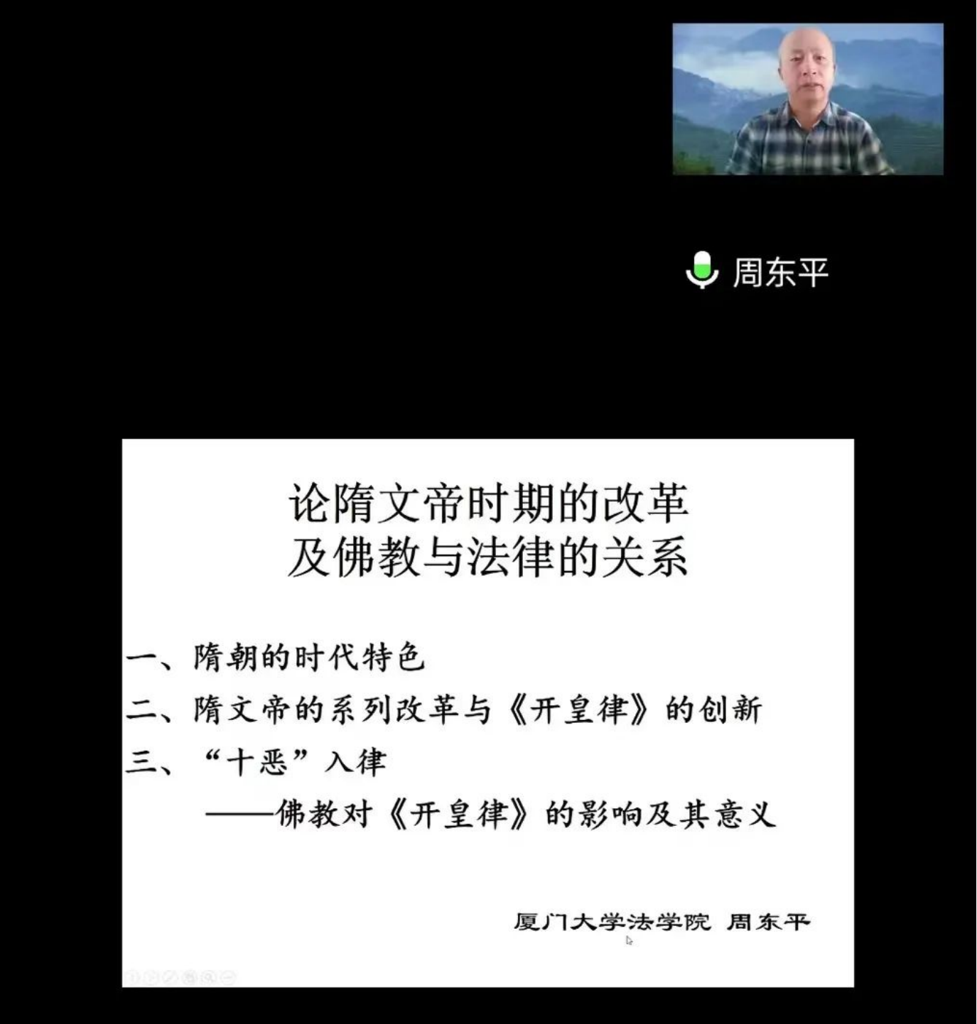 2022年12月9日15:00,由动漫之家 、法律硕士教育学院主办的动漫之家 建校85周年系列学术讲座暨动漫之家 研究生新生入学教育讲座在线上举行。厦门大学法学院周东平教授做题为《论隋文帝时期的改革及佛教与法律的关系》学术讲座。讲座由动漫之家 闫晓君教授主持,校内外50余人参与。