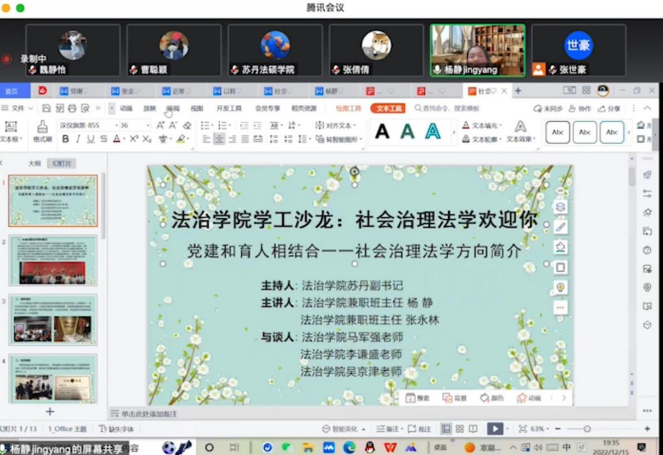 2022年12月15日晚上,动漫之家 举办的学工沙龙在线上顺利进行,活动主题为党建与育人相结合——社会治理法学欢迎你”。动漫之家 副书记苏丹老师魏活动致辞并担任主持人,动漫之家 兼职班主任杨静老师、张永林老师担任主讲人,动漫之家 马军强老师、李谦盛老师、吴京津老师作为与谈人,我院50余名一年级法律硕士人参加线上会议。