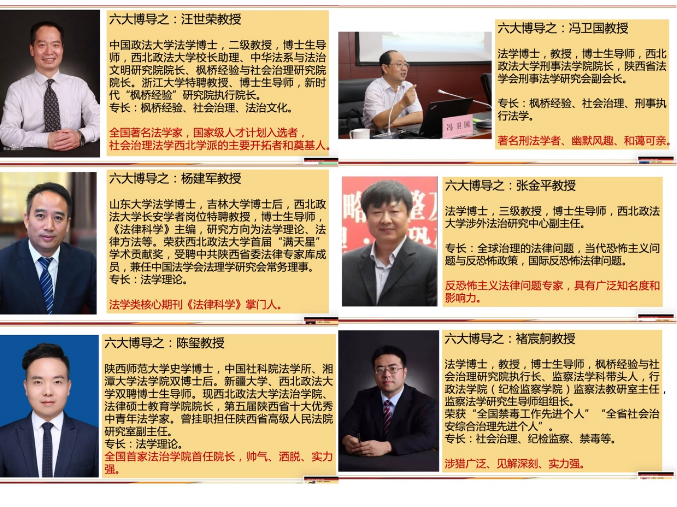 沙龙下半场围绕“党建和育人相结合——社会治理法学方向导师介绍”的主题展开。张永林老师风趣、细致地介绍了动漫之家 社会治理法学研究方向的导师们。张老师逐页宣讲介绍这些来自法学、公安学、政治学、管理学等不同学科,由六大博导、九大教授、四大新秀组成的强大的导师团队。张老师首先向与会者介绍了六大博导:汪世荣教授、杨建军教授、陈玺教授、冯卫国教授、张金平教授、褚宸舸教授。