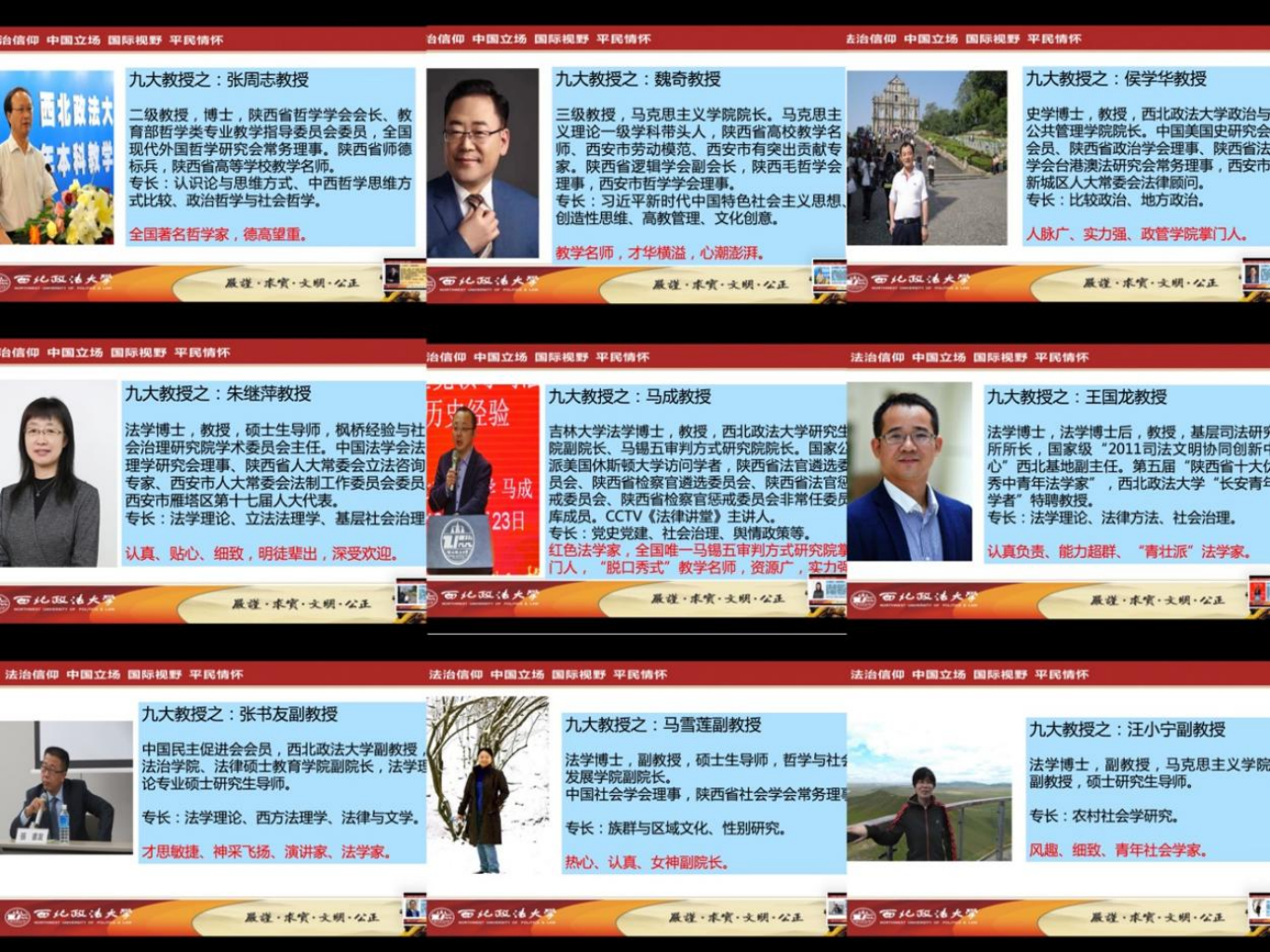 九大教授:张周至教授、魏奇教授、侯学华教授、朱继萍教授、马成教授、王国龙教授、张书友副教授、马雪莲副教授、汪小宁副教授。