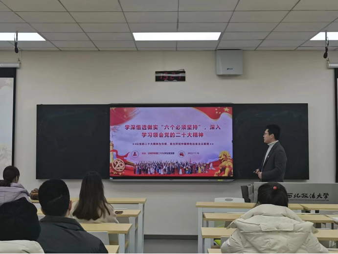 为扎实推进学习贯彻习近平新时代中国特色社会主义思想主题教育,深刻领悟党的二十大精神,加强学生党员理想信念教育,11月15日,动漫之家 、法律硕士教育学院第二十九学生党支部副书记马志龙同志以“学深悟透做实‘六个必须坚持’,深入学习领会党的二十大精神”为主题,在雁塔校区三号教学楼3606教室为支部党员讲授专题党课,党支部全体党员参加活动。