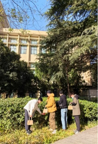 晓明老师讲述了中国“袋”文化与拓印文化的演变历史,简要介绍了水彩手绘和植物拓印的方法以及各自特点,针对绘画材料的选用、作画的步骤进行了详细解读,指导同学们在帆布袋面上进行艺术创作。讲解结束后,晓明老师带领同学们在校园内寻找拓印所需植物,引领同学们发现大自然的美。