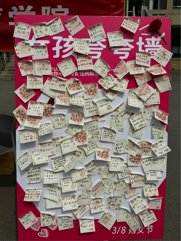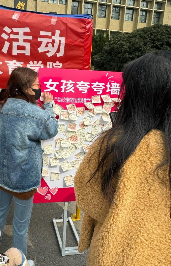 活动现场,“女孩夸夸墙”成为了焦点。同学们纷纷驻足,执笔写下对女性的敬意与祝福。一句句真挚话语如春日暖阳,既传递尊重与欣赏,更凝聚成激励成长的“她力量”。展板上盛放的留言之花,映照着校园平等包容的文化底色。
