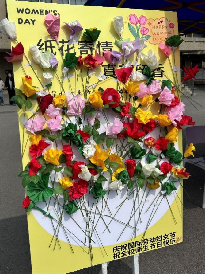 “纸花寄情,真花留香”环节同样精彩纷呈。当皱纹纸在巧手中蜕变为缤纷花朵,创意的火花与手作的温度在此交织。用纸艺兑换真花,既留存匠心之美,又将馥郁花香赠予师生。活动现场,师生共话技艺,长辈与青年携手创作,手中的鲜花艳丽夺目,展板上的纸花栩栩如生,缤纷的色彩为春天增添了更多活力。