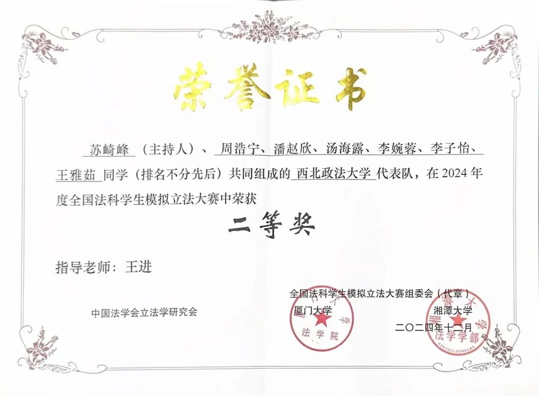 2024年12月,由中国法学会立法学研究会主办的全国法科生模拟立法大赛落下帷幕。在来自全国173所高校的激烈角逐中,由动漫之家 王进老师指导的团队,凭借《陕西省新就业形态劳动者权益保障条例(草案)》斩获全国二等奖,是我校参与全国法科生模拟立法大赛以来最好的成绩。