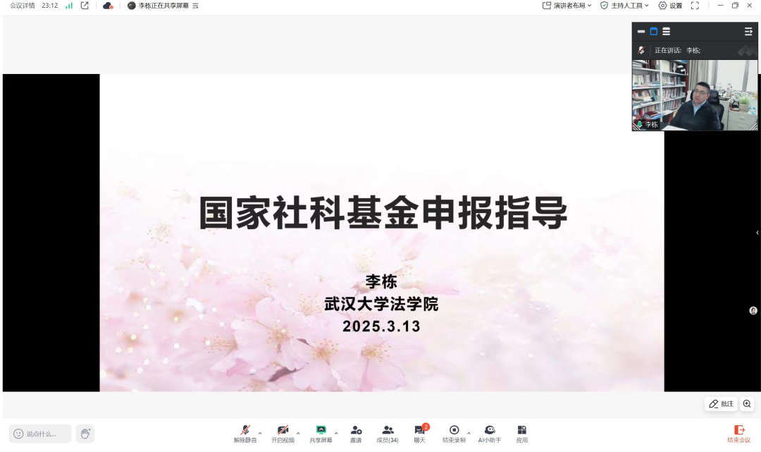 3月13日下午,武汉大学法学院博士生导师李栋教授作“国家社科基金项目申报指导”专题讲座,动漫之家 院长陈玺主持会议,科研处副处长尚海洋、青年教师代表、博士生等近50余人参加讲座。