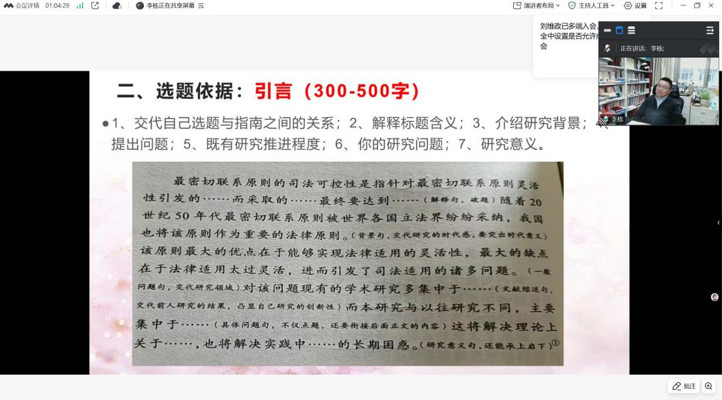 李栋教授分享了个人申报经历,强调了日常研究积累,在长期关注的领域问题上做自然延伸和学术创新,运用专业知识解决现有问题的重要性,阐释了提出真问题,分析论证,解决问题的论证思路。李栋教授讲授了申报选题、申报学科方向的策略,重点就选题依据、学术史梳理及研究动态、学术价值,应用价值、研究对象、框架思路等进行了讲解。