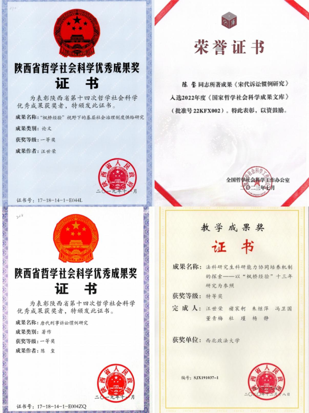 建立科研“传帮带”工作机制,每两个月召开一次经验分享交流会,对青年教师的科研成果雏形进行一对一指导。定期举办学术研究指导交流会,邀请校内外专家学者围绕有组织科研、课题申报、科研成果转化等进行指导培训。坚持把习近平法治思想的研究阐释作为首要任务,引导广大教师扎根中国文化、立足中国国情,将个人研究与党的创新理论、社会需求和学科专业建设结合起来,聚焦新时代“枫桥经验”、社会基层治理、陕甘宁边区法制史、马锡五审判方式、中国法律史等重点领域深入开展科学研究。汪世荣教授主编的著作《“枫桥经验”:基层社会治理的实践》,成为“枫桥经验”研究领域引证最多的专著。由汪世荣教授担任首席专家的陕西省“三秦学者”创新团队推出的“枫桥经验”系列研究专著被“枫桥经验”陈列馆悉数收藏和展出。陈玺教授的专著《宋代诉讼惯例研究》入选《国家哲学社会科学成果文库》。马成教授主持的陕西省社科基金专项项目《学习贯彻习近平法治思想常态机制研究》,为深入推进习近平法治思想进教材、进课堂、进头脑,提供了可行范式与路径。