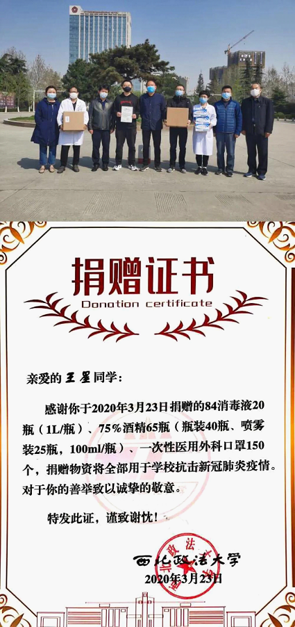 谈及这次捐赠,王星说:“作为政法学子,退役军人,在疫情防控决胜期,更应该尽自己一份绵薄之力,为学校的防控疫情、为在校师生的健康保障,贡献自己的一份力量。”在这场防控疫情阻击战中,我校退役军人王星同学奋勇争先,真正做到退伍不褪色,用责任感和行动力诠释退役军人的勇敢与担当。