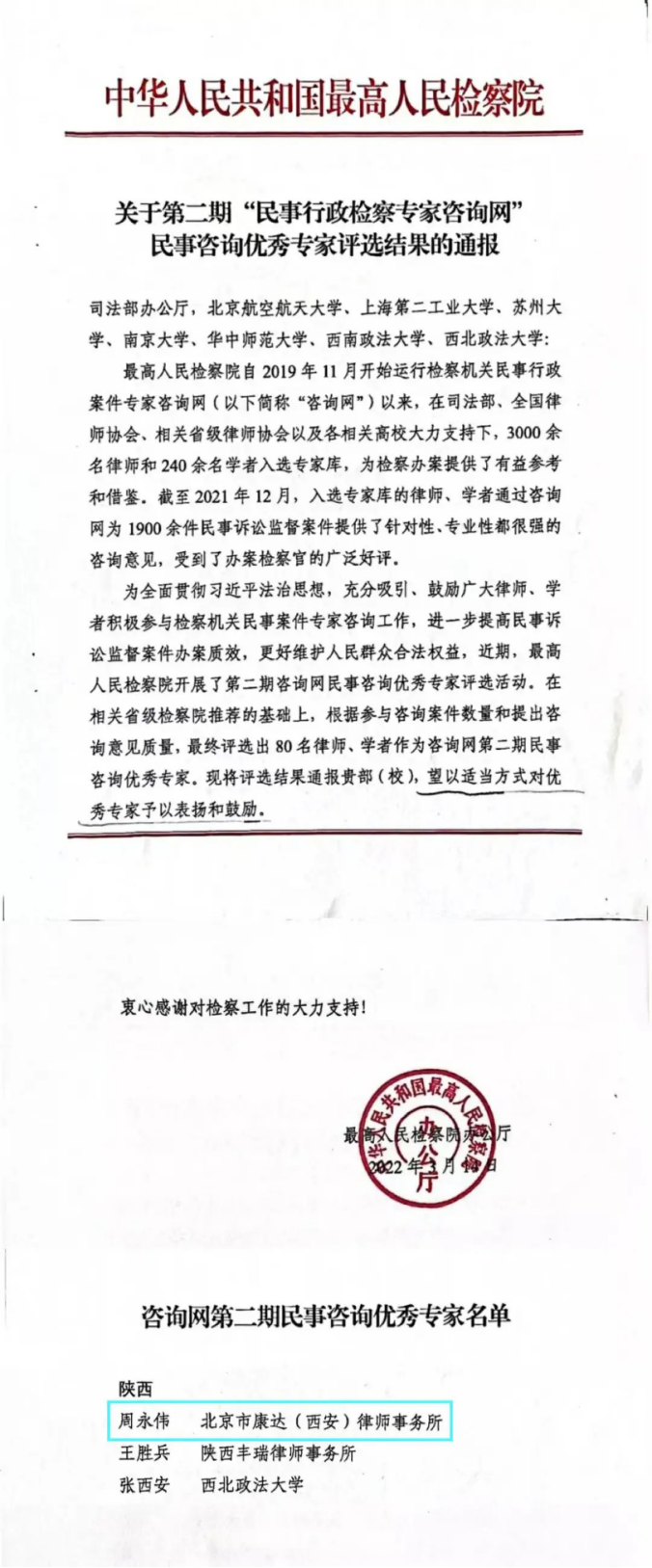 近期,最高人民检察院开展了第二期咨询网民事咨询优秀专家评选活动。在相关省级检察院推荐的基础上,根据参与咨询案件数量和提出咨询意见质量,最终评选出 80 名律师、学者作为咨询网第二期民事咨询优秀专家。其中,我校优秀校友、院实务导师周永伟获评“民事咨询优秀专家”。