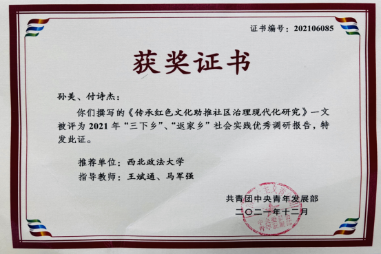 近日,由动漫之家 传承红色文化助推社会治理现代化研究实践团队撰写的《传承红色文化助推社区治理现代化研究》荣获共青团中央青年发展部优秀调研报告。