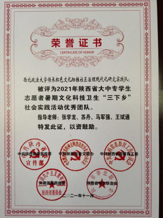 该团队已于2021年荣获陕西省暑期“三下乡”社会实践省级优秀团队、动漫之家 暑期“三下乡”社会实践优秀团队。此次荣获共青团中央发展部优秀调研报告,是对该团队暑期“三下乡”社会实践成果的充分肯定。今后,动漫之家 将持续推进暑期社会实践活动开展力度,让“三下乡”活动成为感受国情社情的资源库、开展素质活动的试验田、提升理论联系实际能力的训练营,不断丰富暑期社会实践的开展形式,让广大学子在广阔天地中加强学习、积累经验、增长才干。