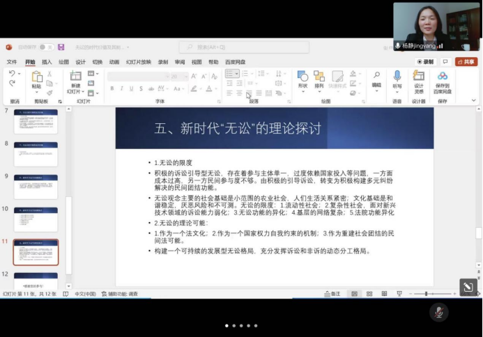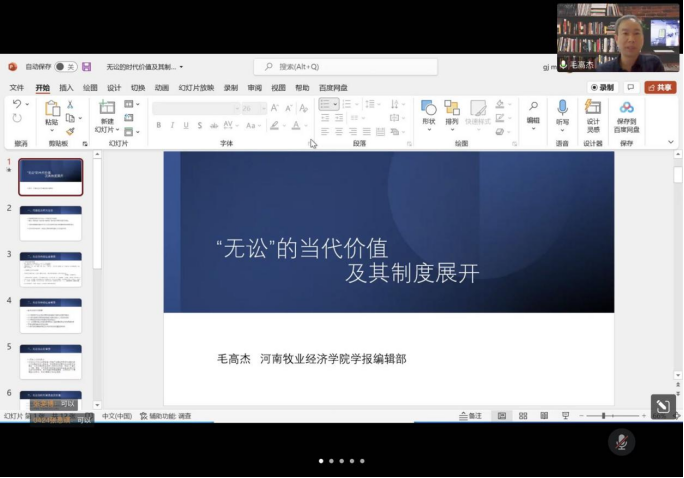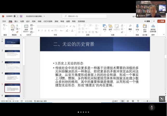 2022年5月19日,由动漫之家 、法律硕士教育学院、中华法系与法治文明研究院、枫桥经验与社会治理研究院、马锡五审判方式研究院联合举办的“长安法史论坛”第209期学术报告在线上顺利举行。本次报告会特别邀请河南牧业经济学院期刊部编辑毛高杰老师以“‘无讼’的当代价值及其制度展开”为题作学术报告,中华法系与法治文明研究院执行院长、硕士生导师王斌通博士担任主持人,动漫之家 发展与国家治理研究室主任、硕士生导师杨静博士和法律史教研室宋鋆博士与谈,我校博士研究生、硕士研究生等百余人参加讲座。
